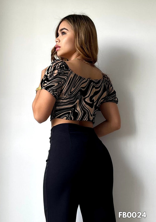 Nude and Black Crop Top with Wavy Velvet Stripes